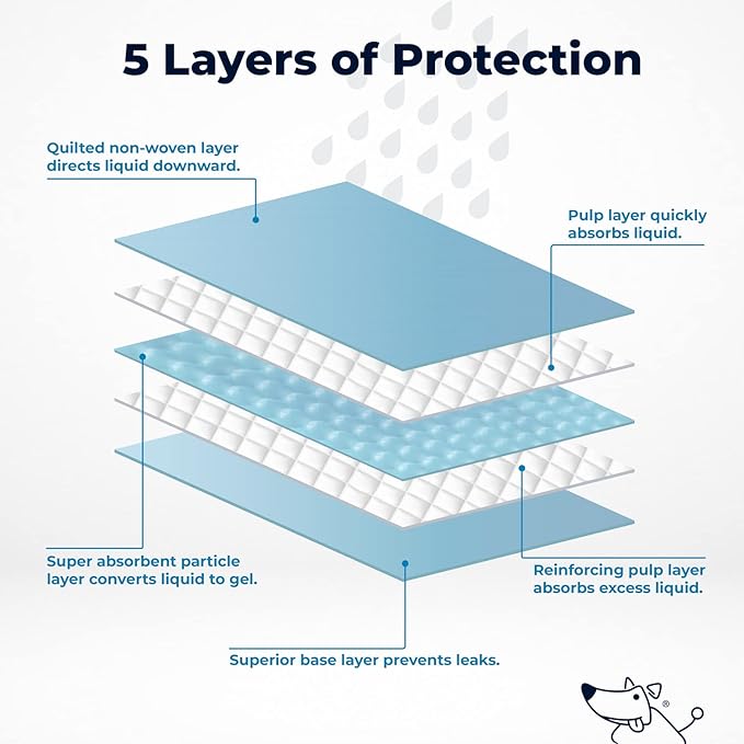 - Splash-Prevention Quilted Pattern – Our pee pads for puppies boast an embossed pattern that helps direct urine and slow the spread, while the strong backing and sealed edges help prevent leaks for safer, more reliable indoor crate training